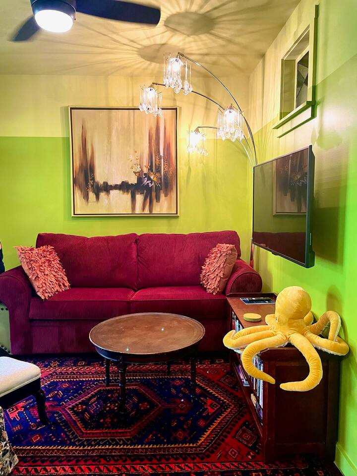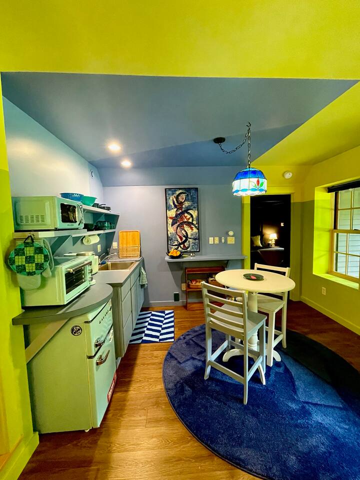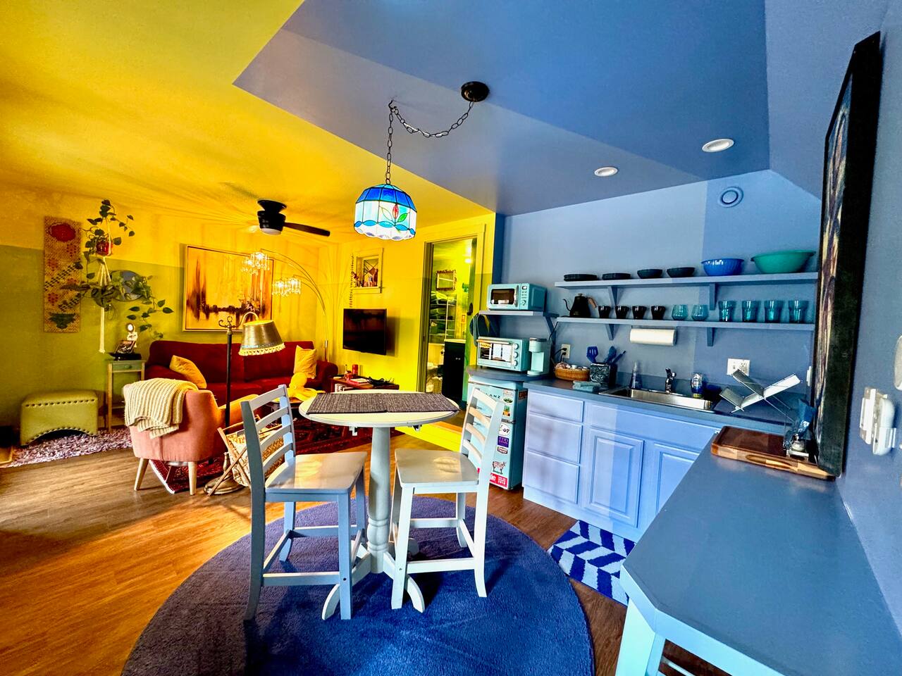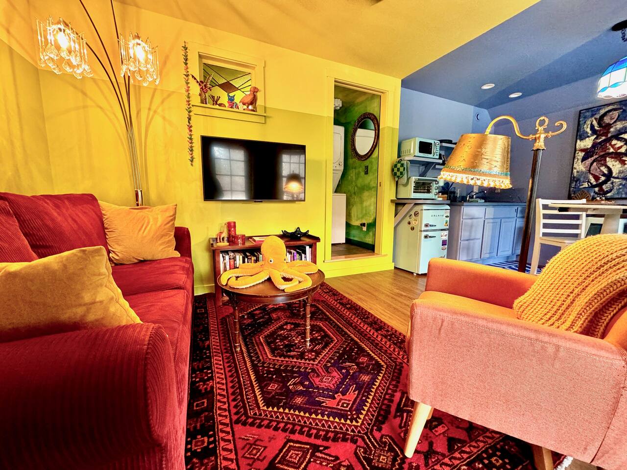 Escape to a vibrant woodland retreat that blends rustic charm with bold, funky design. Nestled on the edge of the forest, our unique getaway offers a colorful, eclectic interior where each corner has personality. Think bright hues, unexpected decor, and playful touches that make each room feel like an adventure. Wander trails on the property through fields and woods while nibbling seasonal delights like blackberries and blueberries and explore the meadow labyrinth.